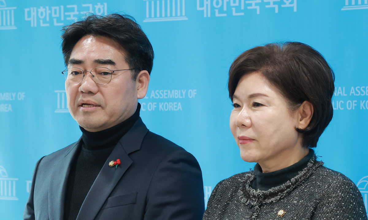 국민의힘 소장파 '대안과미래' 간사인 이성권 의원(왼쪽)이 4일 국회 소통관에서 이날 송언석 원내대표, 장동혁 대표와 차례로 면담한 내용을 발표하고 있다. 오른쪽은 대안과미래 소속 조은희 의원. 연합뉴스