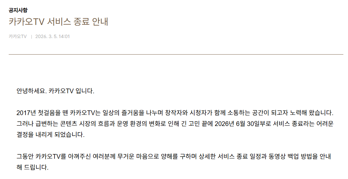 카카오는 이번 공지를 통해 “콘텐츠 시장의 흐름과 운영 환경의 변화로 인해 긴 고민 끝에 서비스 종료라는 어려운 결정을 내리게 됐다”고 설명했다. 숏폼 콘텐츠와 OTT 서비스의 범람 속에서 전통적인 동영상 플랫폼의 입지가 좁아진 점이 결정적인 원인으로 분석된다.