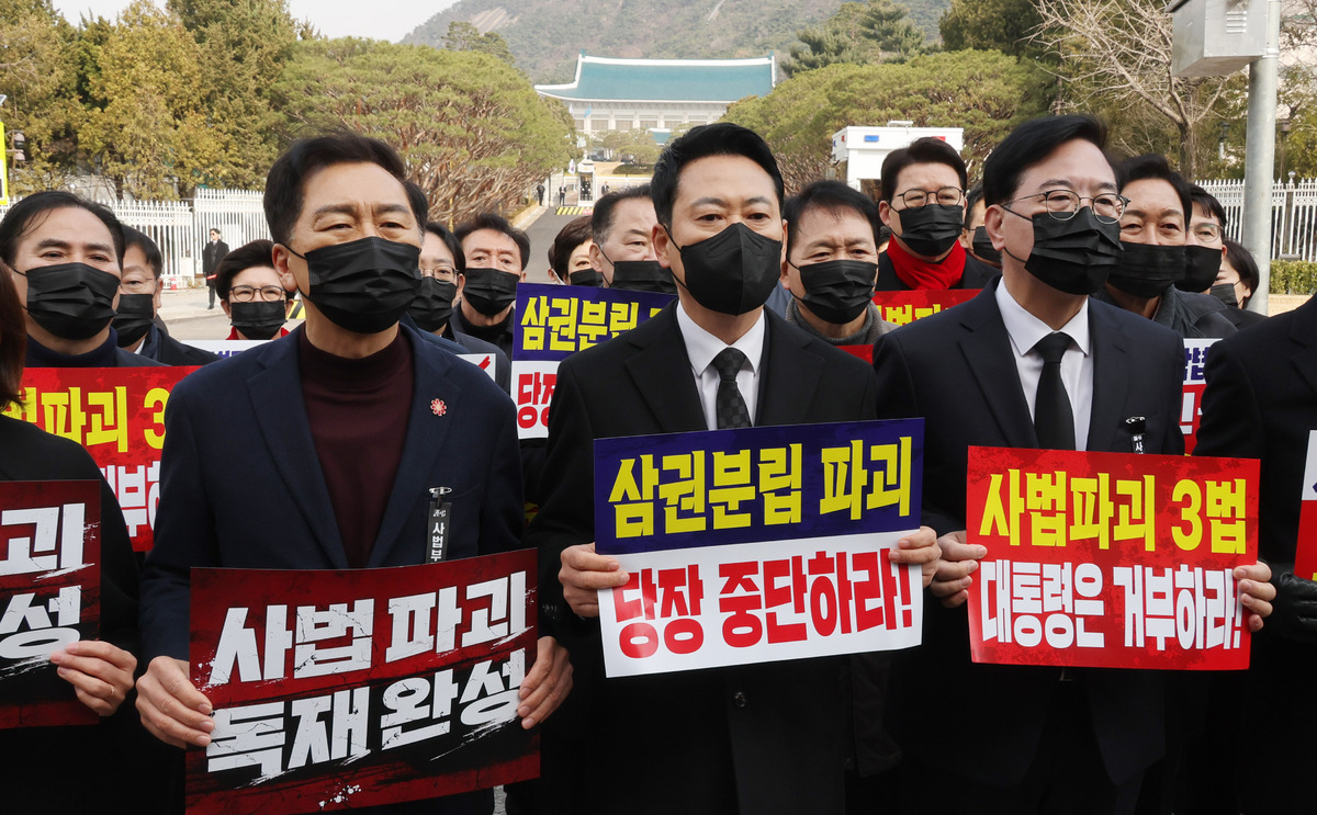 국민의힘 장동혁 대표(가운데)와 송언석 원내대표(오른쪽) 등 국민의힘 지도부가 5일 청와대 사랑채 앞에서 현장 의원총회를 마친 뒤 ‘사법파괴 3법’ 등이 적힌 손팻말을 들고 항의시위를 하고 있다. 장 대표는 “이 정권은 사법부를 발아래 두고 독재의 액셀러레이터를 더욱 거세게 밟을 것”이라고 말했다.
