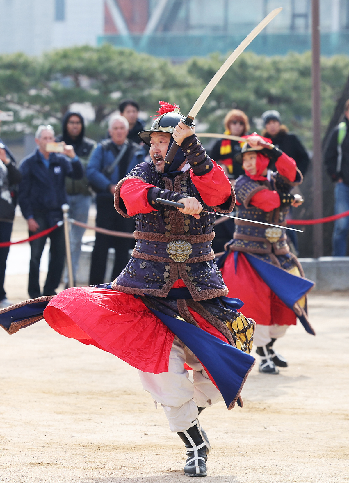 5일 경기 수원시 화성행궁 앞에서 수원시립공연단이 무예24기 시범공연을 하고 있다. 무예24기 시범 상설공연은 혹한기 정기휴연을 마치고 이달 3일부터 재개됐다.
