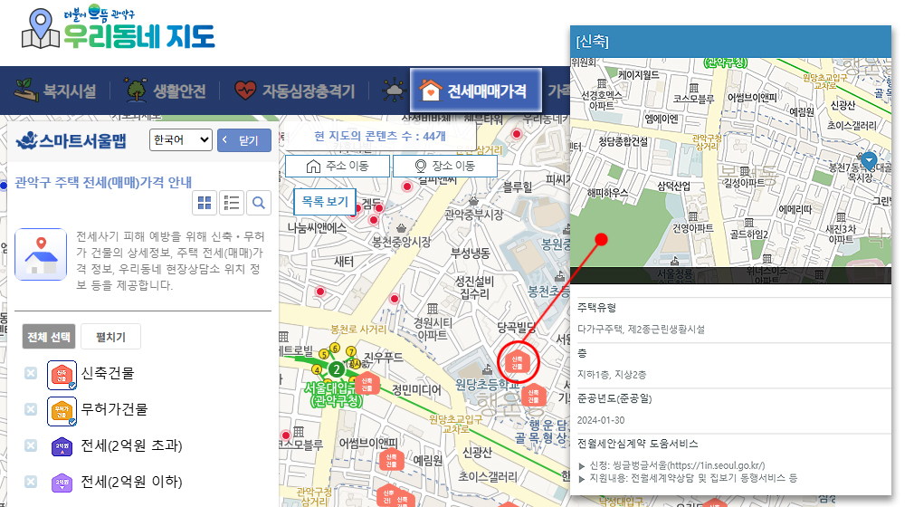 관악구청 홈페이지 ‘우리동네지도’ 화면, 신축·무허가 건물 정보와 주택 전세·매매 가격 등을 확인할 수 있다. 관악구 제공