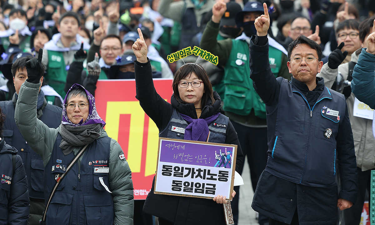 민주노총은 투쟁 선언문을 통해 직장 내 성차별 구조를 바꾸는 성평등 단체협약 체결, 성평등 임금 공시제 도입, 차별금지법 제정 등을 촉구했다.