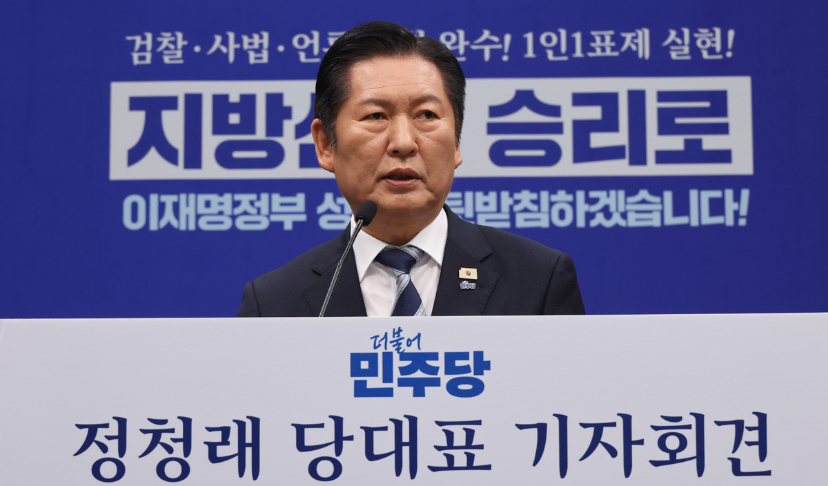 정 대표는 이날 여의도 국회에서 기자회견을 열고 "국민주권정부 이재명 정부를 성공시키기 위해 당원주권정당 민주당이 이번 지방선거에서 반드시 승리해야 한다"며 "6.3 지방선거 승리에 저의 모든 것을 걸겠다. 지방선거 승리에 도움이 되면 하고 도움이 안되면 하지 않겠다. 6.3 지방선거 승리가 당대표인 저의 지상과제다."라고 강조했다.