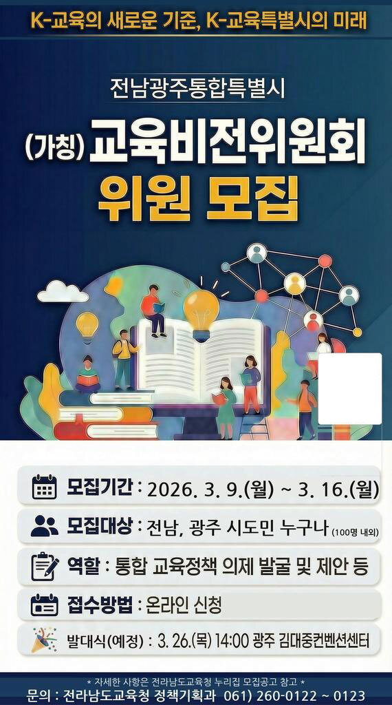 위원회는 약 100명 규모로 꾸려지며, 전남·광주 시도민을 대상으로 공개 모집을 통해 위원을 선발한다. 신청은 전남교육청 누리집에서 가능하며 모집 기간은 16일까지다.