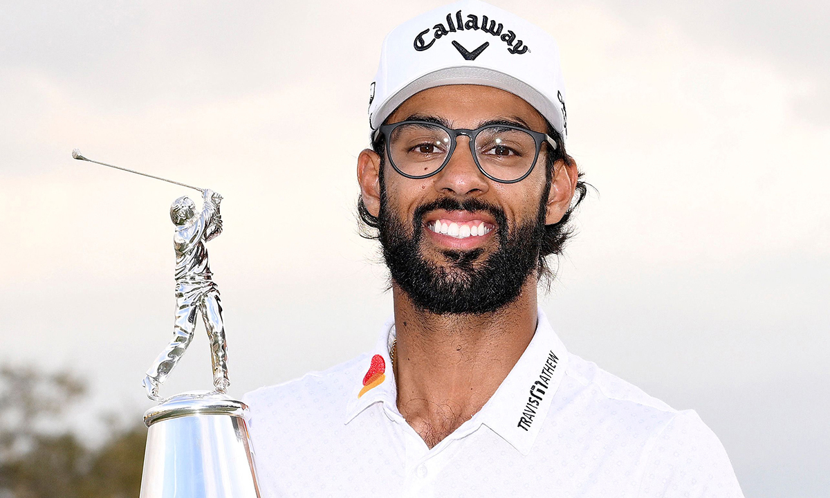악샤이 바티아(미국)가 9일 미국 플로리다주 올랜도의 베이힐 클럽 앤드 로지에서 열린 PGA 투어 아널드 파머 인비테이셔널에서 우승한 뒤 트로피를 들고 밝은 표정을 짓고 있다. 올랜도=AFP연합뉴스