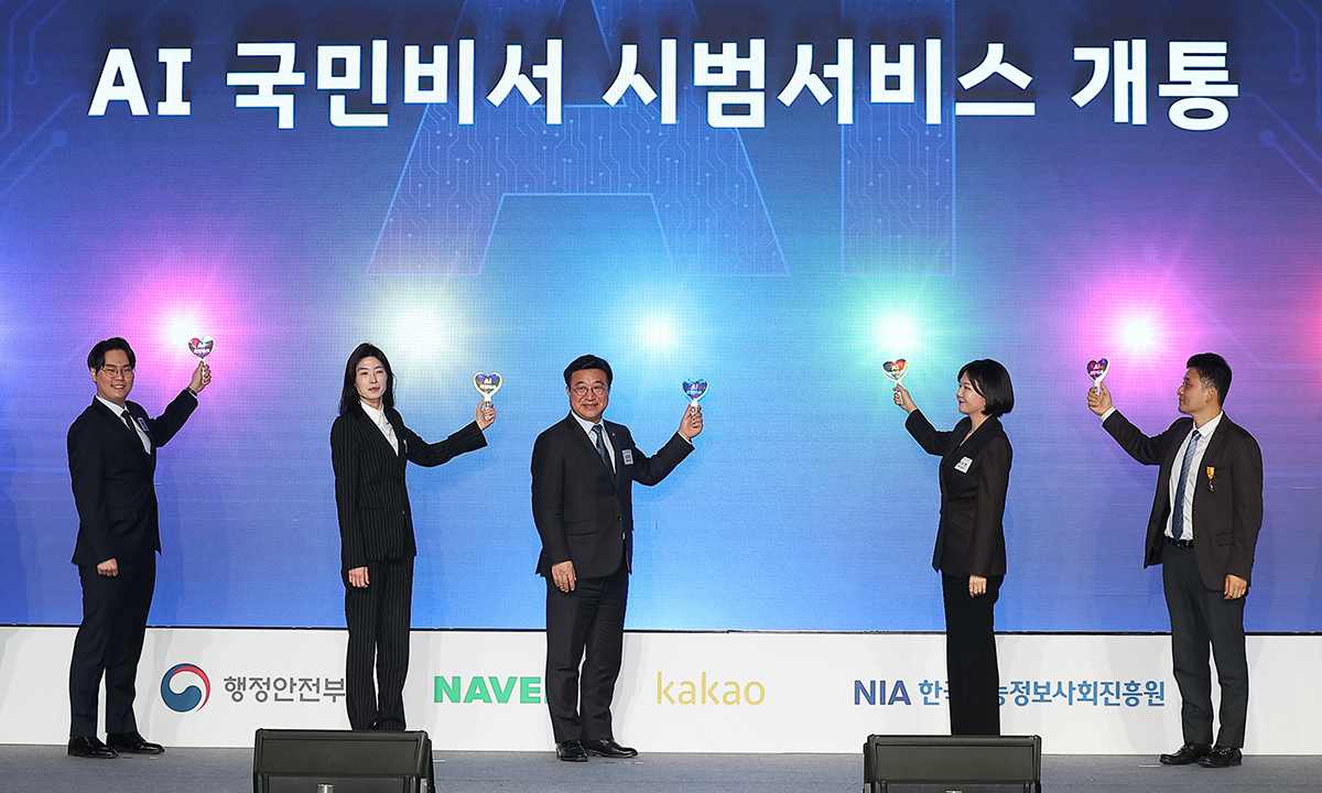 윤호중 행정안전부 장관(가운데)이 9일 경기 성남시 분당구 경기창조경제혁신센터에서 열린 ‘AI 국민비서 시범서비스 개통식’에서 정신아 카카오 대표(왼쪽 두번째)와 최수연 네이버 대표(왼쪽 네번째) 등 참석자들과 기념 촬영을 하고 있다. AI 국민비서는 정부의 행정 정보와 일정 등을 AI가 개인 맞춤형으로 알려주고 상담까지 해주는 ‘디지털 행정 비서 서비스’다.