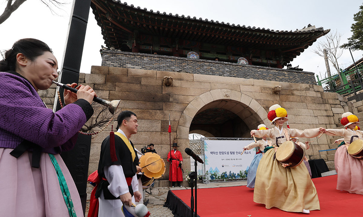 9일 서울 종로구 창의문 앞에서 열린 ‘백악산 한양도성 6개 권역 안내소’ 재운영 개소식에서 축하공연이 펼쳐지고 있다. 백악산 한양도성 탐방객 안내와 탐방로 순찰을 맡는 6개 권역(창의문, 청운대, 곡장, 숙정문, 말바위, 삼청) 안내소는 이날부터 매일 오전 9시부터 오후 6시까지 연중무휴로 운영된다. 향후 탐방객을 위한 전문 해설 프로그램과 다채로운 문화 공연 등도 순차적으로 재개될 예정이다.