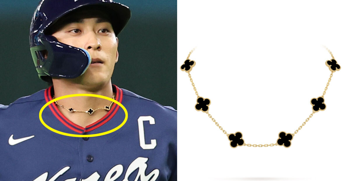 WBC 기간 이정후가 착용한 목걸이는 프랑스 명품 브랜드 반클리프 앤 아펠(Van Cleef & Arpels)의 ‘빈티지 알함브라 네크리스 10 모티브’ 모델로, 국내 공식 판매가는 1550만원 수준이다.