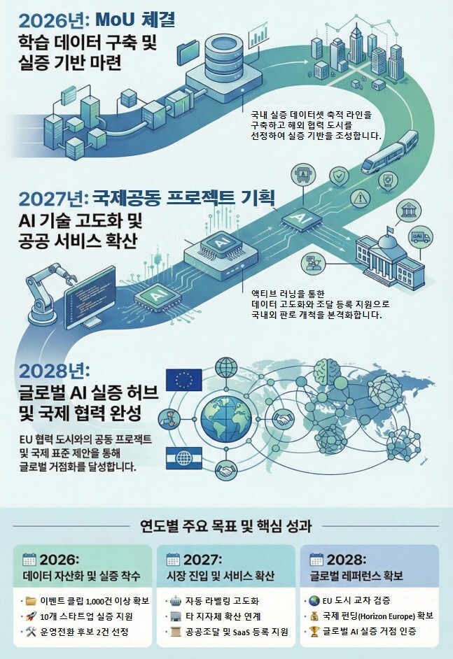 실증을 통과한 기업은 파트너 도시 현장 적용 테스트와 글로벌 조달 연계까지 지원받게 된다. 향후 일정은 올해 실행형 업무협약 체결을 시작으로 2027년 국제 공동 파일럿 기획, 2028년 국제 공동 실증 및 글로벌 AI 실증 허브 구축이 진행될 전망이다.