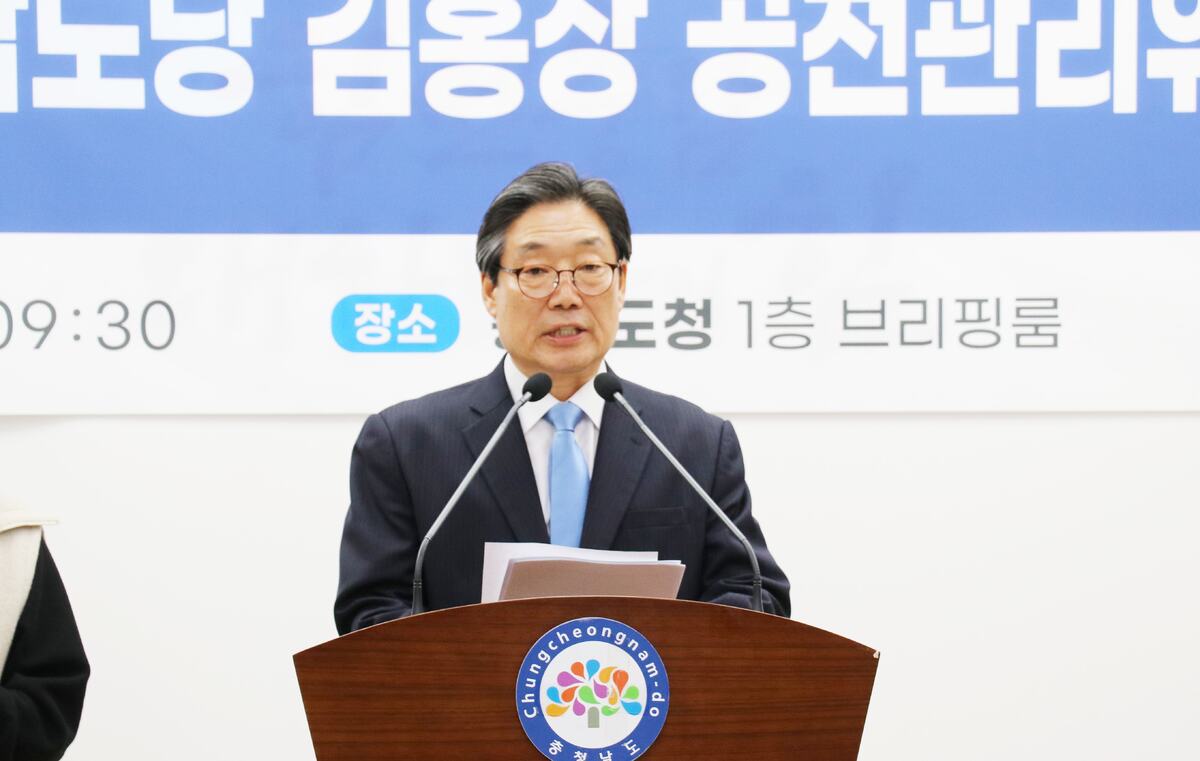 김홍장 충남도당 공직선거후보자추천관리위원장은 10일 충남도청 프레스센터에서 기자회견을 열고 “충남 도민의 눈높이에 맞춘 민심 공천으로 국민주권정부의 성공을 완성하겠다”며 이번 지방선거 공천 원칙과 방향을 밝혔다.
