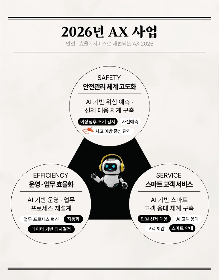공사는 AI정보지원단을 중심으로 도시철도 운영 전반의 지능화에 나선다. 올해 △안전관리 체계 고도화 △운영·업무 혁신 △스마트 고객 서비스 △AX 역량 강화 4개 분야에서 선정한 AI 과제 35개를 추진한다.
