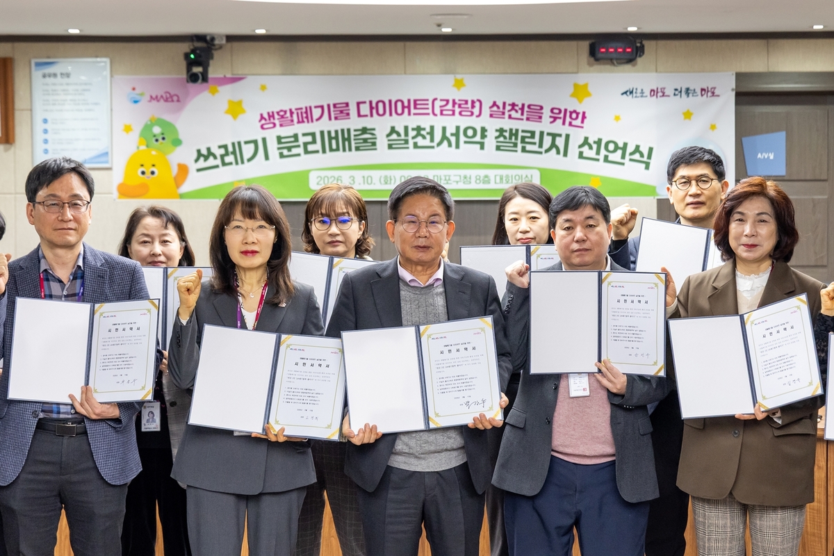마포구(구청장 박강수)가 10일 오전 구청 대회의실에서 ‘쓰레기 분리배출 실천 서약 챌린지 선언식’을 개최하고 생활폐기물 감량을 위한 본격적인 행보에 나섰다. 이번 챌린지는 올해 1월부터 시행된 수도권 생활폐기물 직매립 금지 정책에 대응하기 위한 ‘생활폐기물 다이어트 천만 시민 실천 프로젝트’의 일환으로 마련됐다.