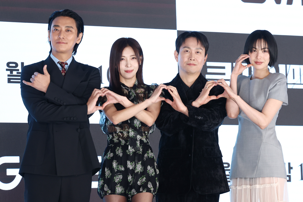 배우 주지훈, 하지원, 오정세, 나나(사진 왼쪽부터)가 10일 서울 신도림 더 세인트 웨딩에서 열린 ENA 월화 드라마 ‘클라이맥스’의 제작발표회에 참석해 포즈를 취하고 있다.