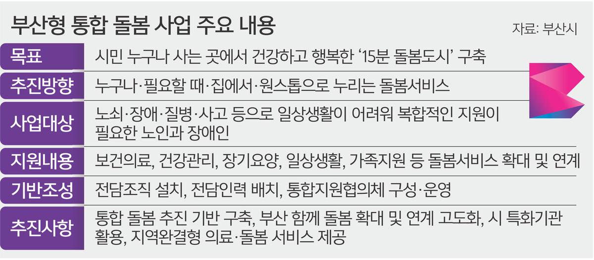 부산형 통합 돌봄이 본격적으로 시행되면, 의료·요양·복지 서비스를 각각 신청하고 개별적으로 상담받던 것에서 읍·면·동 중심의 통합창구에서 상담과 신청, 계획수립이 한번에 이뤄진다. 또 기존 1만5000명이던 돌봄 서비스 혜택 인원이 5만명까지 늘어나고, 공공·민간자원 연계를 통해 사각지대가 최소화될 전망이다.