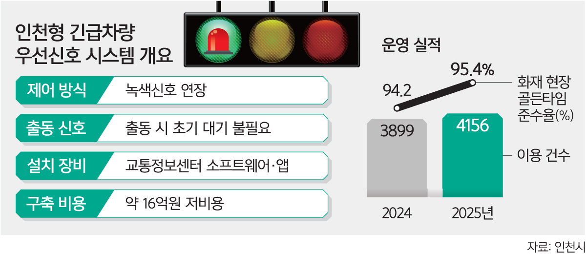인천시는 2023년 전국 최초로 도입한 ‘긴급차량 우선신호 시스템’이 경기도 전역으로 확산한다고 10일 밝혔다. 앞서 시는 과학기술정보통신부가 추진하는 ‘2026년 스마트빌리지 보급·확산 공모사업’에 선정돼 이번 서비스의 고도화를 꾀하게 됐다.