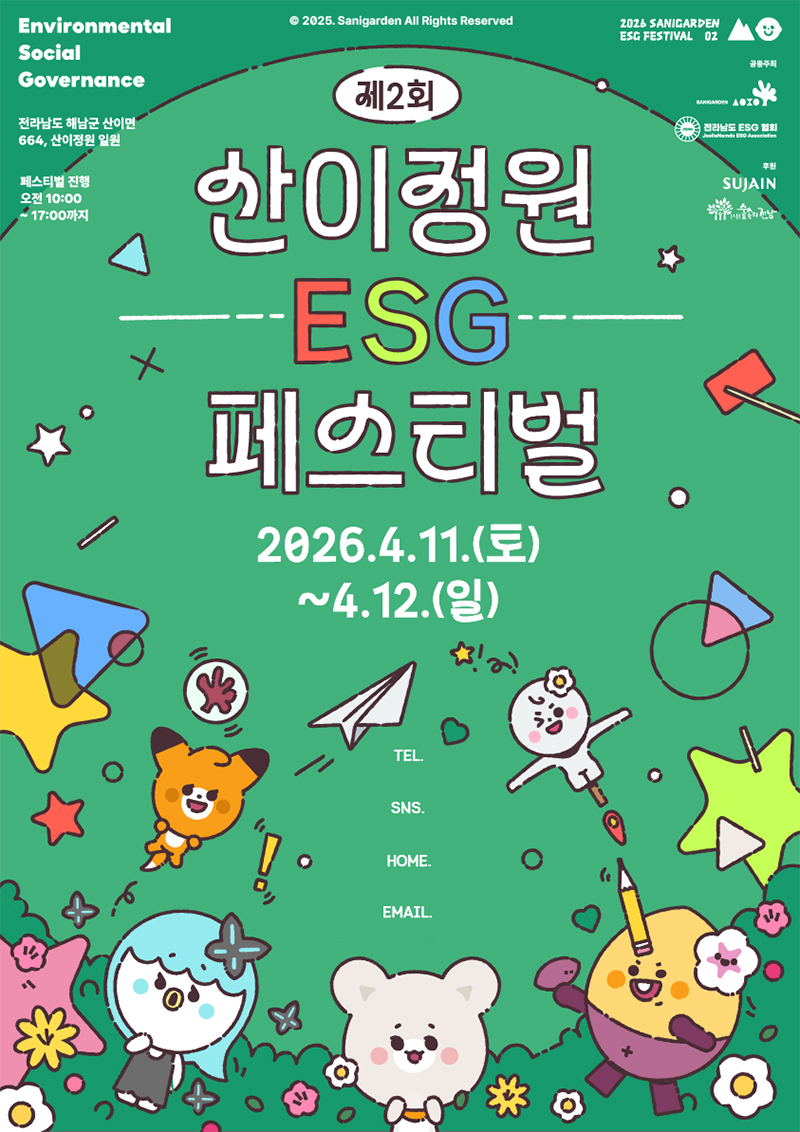산이정원과 전남도ESG협회는 오는 4월 11일부터 12일까지 ‘제2회 ESG 페스티벌’을 개최한다고 11일 밝혔다. 이번 행사는 ‘꽃을 심는 자유, 100년 정원’을 주제로 자연과 공동체가 함께하는 지속가능 문화축제로 마련된다.