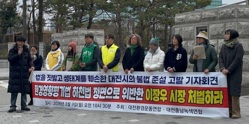 그러면서 “감사원 역시 이번 감사에서 대전시의 행위에 대해 ‘시행기관의 자의적 판단으로 법적 절차가 생략되는 것을 방지하기 위해 마련한 지침을 형해화한 것’이라고 명시했다”며 “지침을 어겨 법이 보호하려 했던 환경적 가치와 절차적 정의를 무너뜨려 놓고 ‘법 위반은 아니다’라고 주장하는 대전시를 강력 규탄한다”고 비판했다.