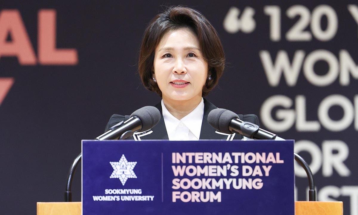 김혜경 여사가 11일 모교 숙명여자대학교에서 열린 세계 여성의 날 기념 행사를 찾아 “대한민국이 명실상부한 실질적 성평등 국가로 나아갈 수 있도록 최선을 다하겠다”고 밝혔다.