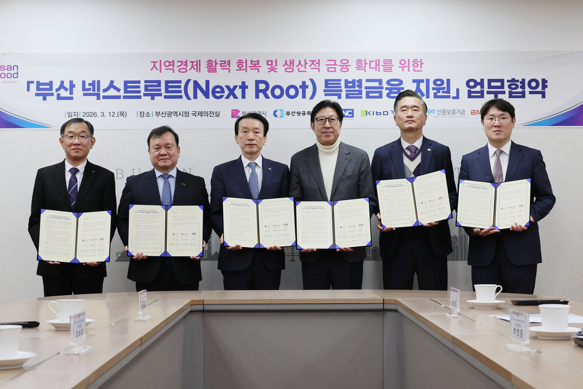 부산시는 12일 시청 국제의전실에서 부산상공회의소·차세대기업인클럽·기술보증기금·신용보증기금·부산은행과 ‘부산 넥스트루트 특별금융 지원’을 위한 업무협약을 체결했다고 밝혔다.