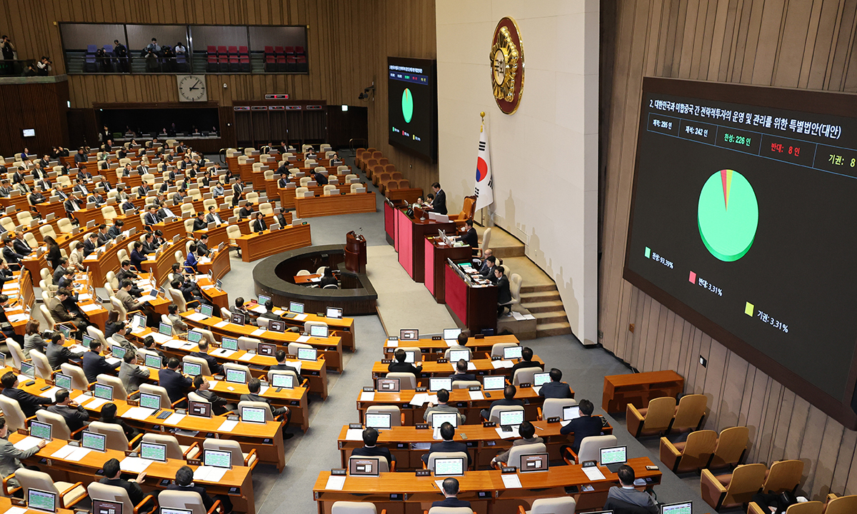 이날 국회를 통과한 대미투자특별법은 한·미 업무협약(MOU)에 담긴 3500억달러 규모의 대미 투자 이행을 위해 한미전략투자공사와 한미전략투자기금을 설치하는 내용이 골자다.