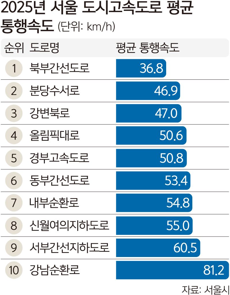 가장 막히는 도시고속도로는 북부간선도로, 분당수서로, 강변북로, 올림픽대로(시속 50.6㎞), 경부고속도로(〃 50.8㎞) 등의 순이었다.