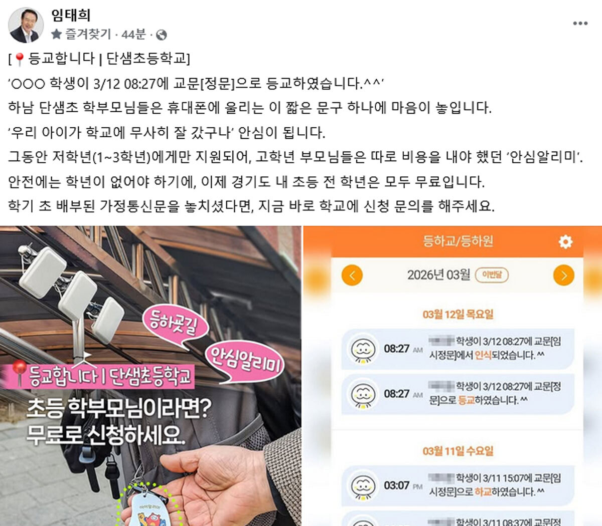 임태희 경기도교육감은 이날 자신의 사회관계망서비스(SNS)에 글을 올려 “안전에는 학년이 없어야 한다. 서비스 이용을 희망하는 학부모는 즉각 학교에 신청해 달라”고 소개했다.