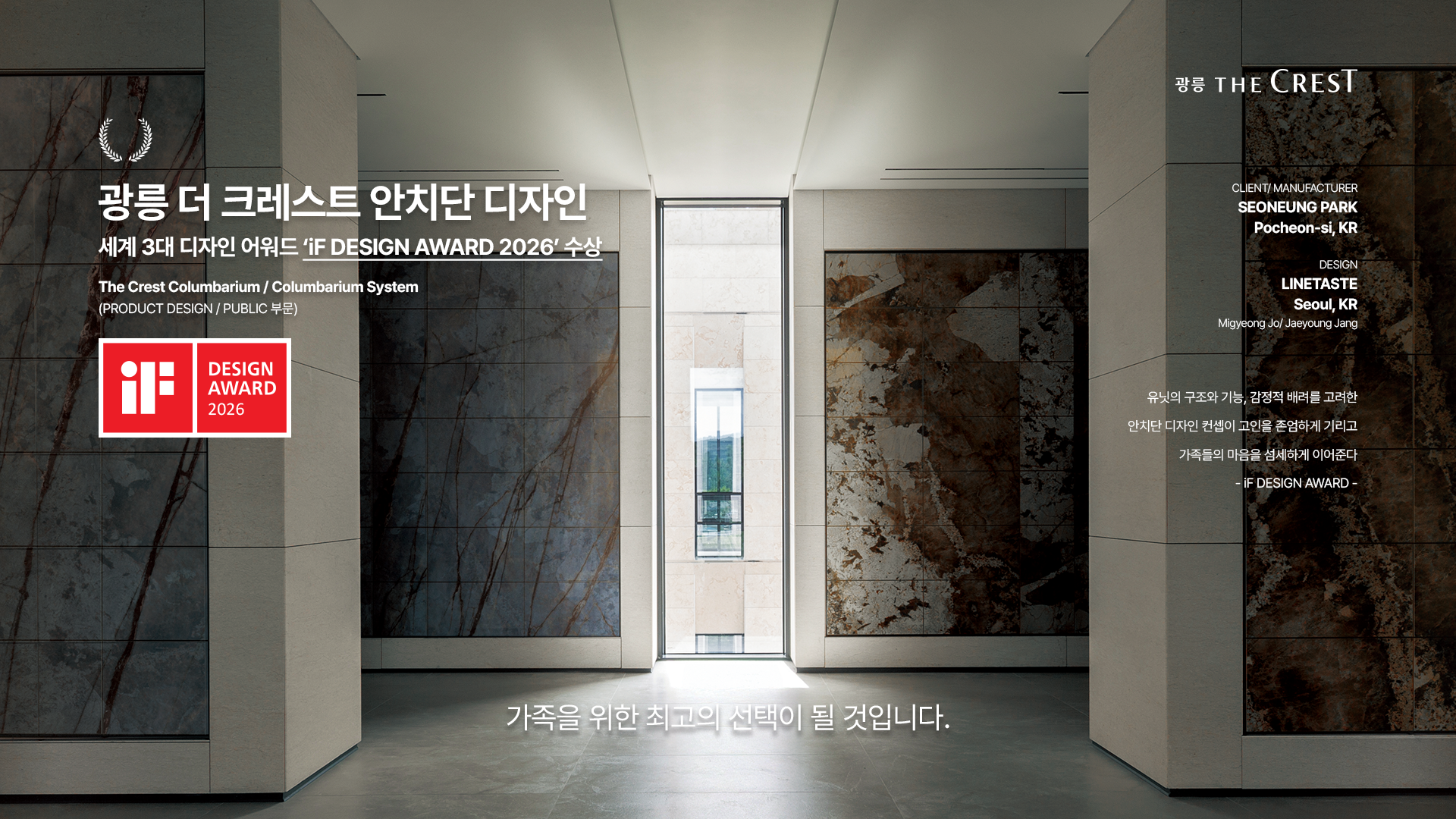 봉안당 ‘광릉 더 크레스트’는 이번 어워드에서 국내 장묘업계에서는 처음으로 프로덕트 디자인(퍼블릭 디자인) 부문에서 본상을 수상하며 프리미엄 봉안당 공간으로서의 디자인 경쟁력을 확인했다.