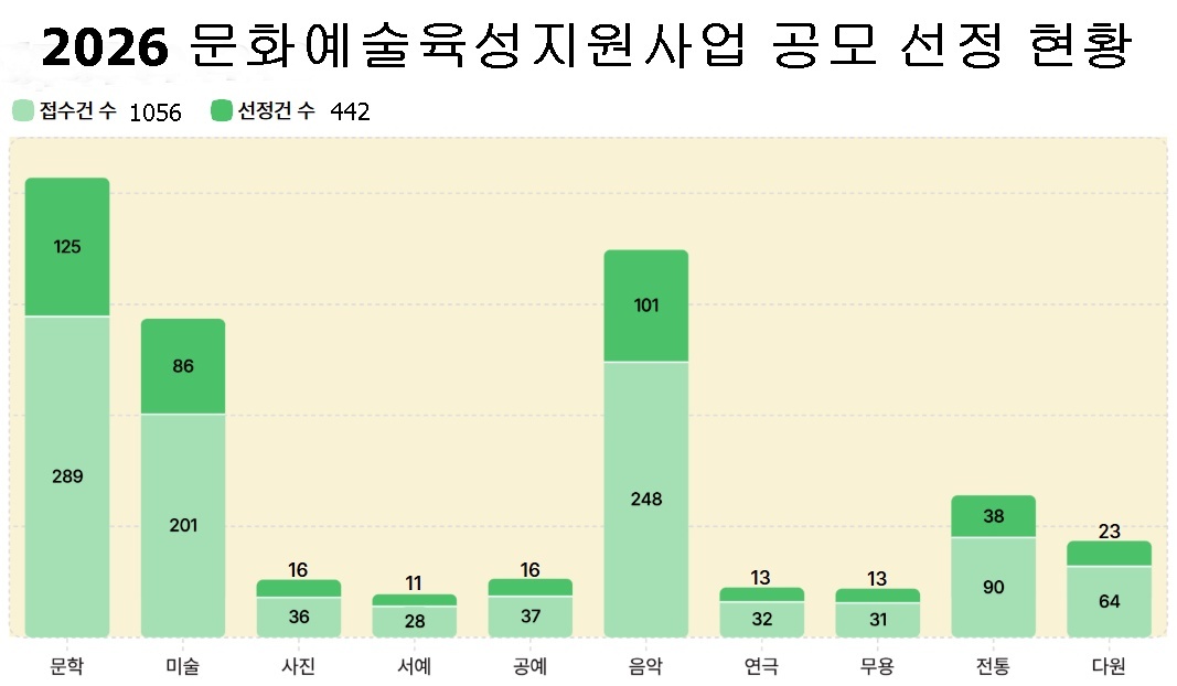 이번 공모에는 총 1056건이 접수됐으며 전문가 심의를 거쳐 442건(41.8%)이 선정됐다. 장르별로는 문학 125건, 음악 101건, 미술 86건, 전통 38건, 다원예술 23건, 사진·공예 각각 16건, 연극·무용 각각 13건, 서예 11건이다.
