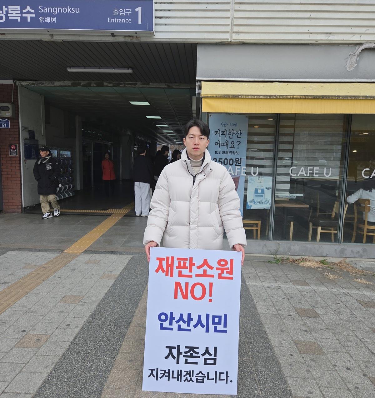15일 지역 정가에 따르면 염정우 국민의힘 안산시의원 예비후보(35·가 선거구)는 전날부터 지하철 4호선 상록수역 앞에서 흰옷을 입고 1인 시위를 이어가고 있다.