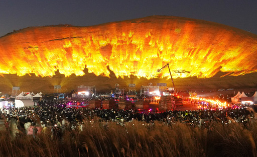 14일 제주도 제주시 애월읍 봉성리 새별오름 일대에서 열린 ‘2026 제주들불축제’에서 레이저와 불꽃이 결합한 ‘디지털 불놓기’가 펼쳐지고 있다.