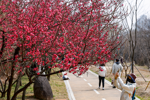 15일 서울 성동구 청계천매화거리에서 시민들이 활짝 핀 홍매화를 구경하고 있다. 매화는 매실나무의 꽃으로 꽃잎 색에 따라 흰매화, 분홍매화, 홍매화로 나뉜다.