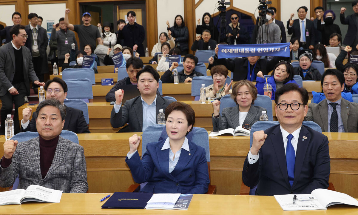 이 최고위원은 모두발언에서 “대통령께서 국무회의를 생중계해서 모든 걸 투명하게 보여준다”며 “이제 음모론 같은 건 필요 없다. 뒤에서 음모를 꾸민다고 해도 믿지 않는다”고 말했다. 친여 성향의 ‘강경 스피커’ 김어준씨의 유튜브 방송에서 제기된 ‘공소취소 거래설’을 겨냥한 발언으로 풀이된다. 이어 서미화 의원이 “대통령님의 지지율은 60% 이상을 늘 상회하는데, 민주당 지지율은 이에 한참 미치지 못하는 것이 현실”이라며 당 지도부를 겨냥한 발언을 하자, 현장 당원 사이에선 “정청래 대표 때문”이라는 호응이 터져 나왔다.