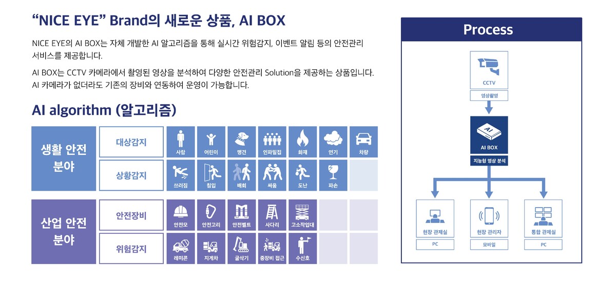 AI BOX는 기존 일반 카메라에 지능형 영상 분석 기능을 추가해 다양한 안전 관리 기능을 구현할 수 있는 AI 솔루션이다. NICE인프라는 자체 개발한 AI 알고리즘을 기반으로 실시간 위험 감지, 이벤트 알림, 이상행동 분석 등 다양한 기능을 제공하며 생활환경과 산업현장의 안전 관리 수준을 높일 수 있도록 설계했다.