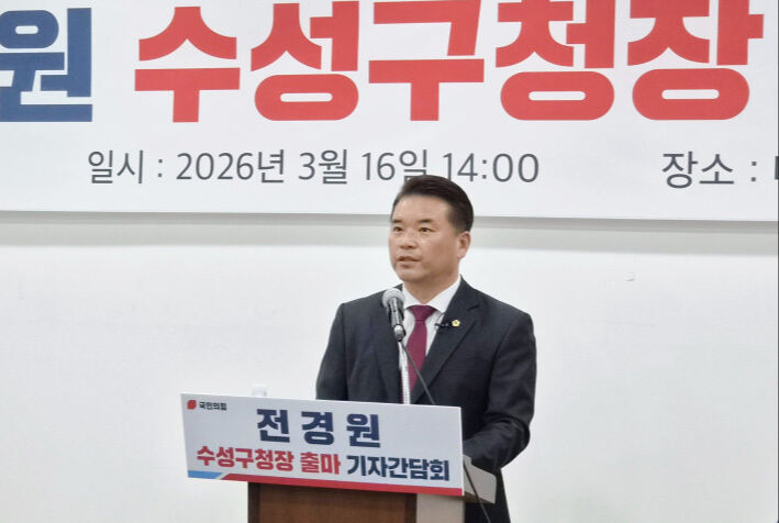 전경원 원내대표는 국민의힘 대구시당에서 기자회견을 열고 6∙3 지방선거에서 수성구청장에 출마하겠다고 16일 밝혔다.