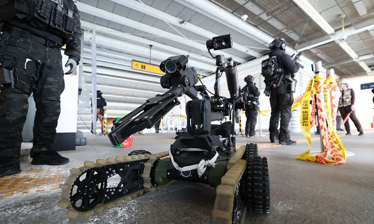 16일 경기 평택시 평택지제역에서 열린 ‘테러 대비 민관·군경·소방 통합 방호 훈련’에서 로봇이 폭발물을 처리하고 있다. 이날 평택시, 경찰, 육군 제51보병사단, 경기남부경찰청 경찰특공대 등이 폭발물 테러 상황을 가정한 훈련을 벌였다.