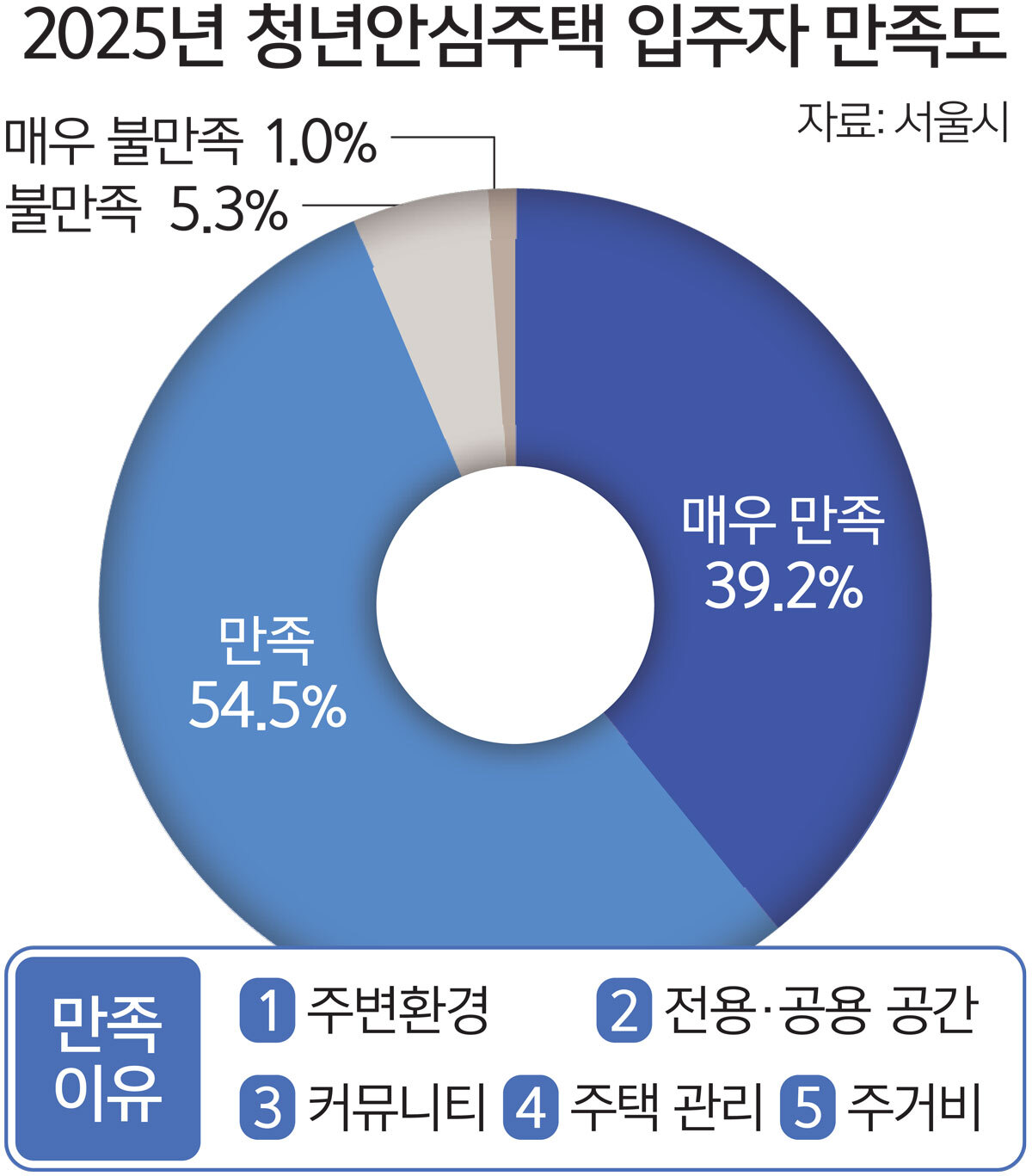 한편 시가 지난해 실시한 청년안심주택 입주자 만족도 조사에 따르면 93.7%가 전반적으로 만족(매우 만족 39.2%, 만족 54.5%)한다고 답했으며 2024년(91.5%) 대비 만족도는 2.2%포인트 상승했다. 만족도가 가장 높았던 부문은 주변 환경(86.6%)이었고, 이어 전용·공용 공간(82.7%), 커뮤니티(82.6%), 주택 관리(65.7%), 주거비(67.5%)였다. 조사는 지난해 12월8일부터 12월15일까지 입주완료 후 6개월이 경과된 신규 14개 단지(4409실) 입주자 1257명을 대상으로 단지 내 안내 포스터와 QR코드를 활용한 온라인 방식으로 진행됐다.
