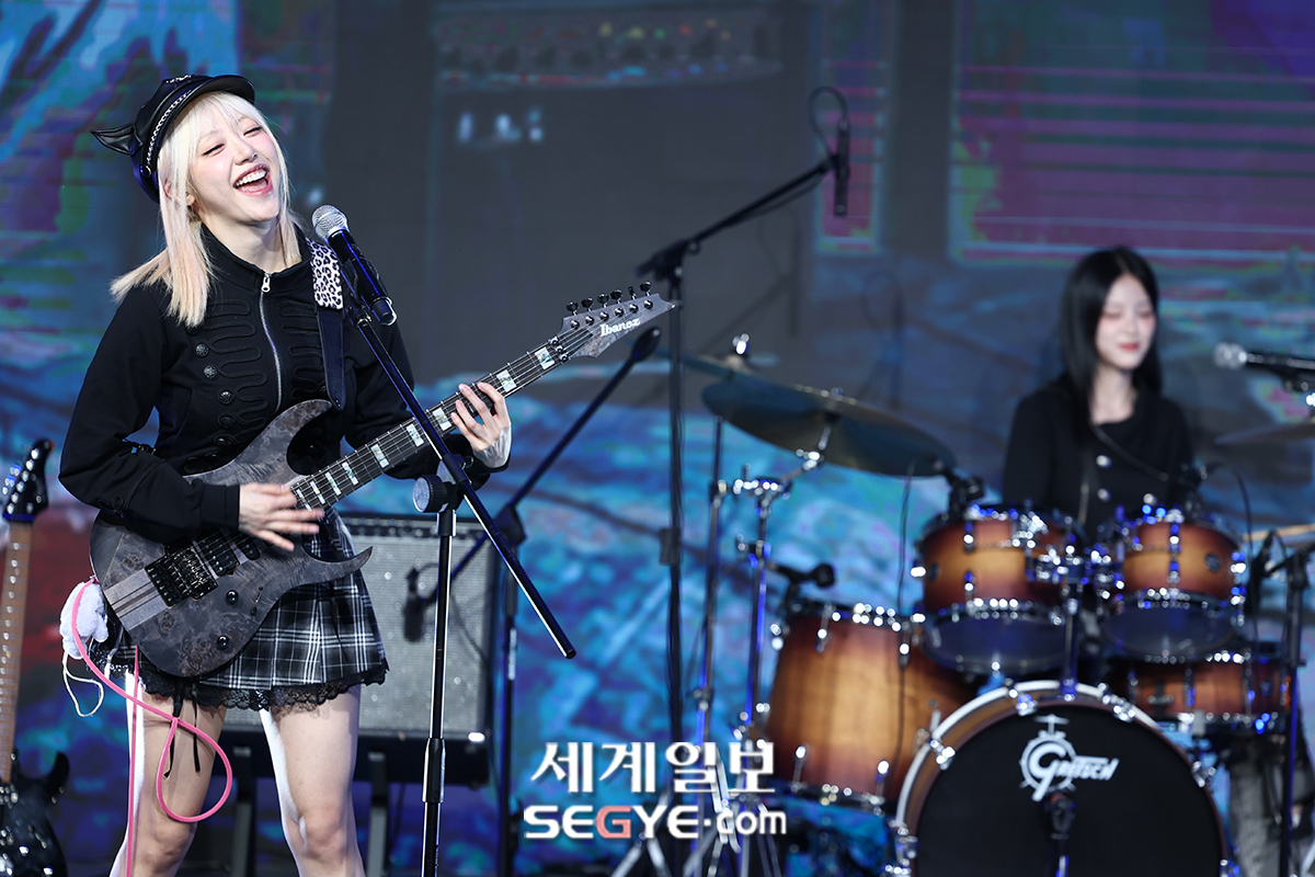 신인 밴드 레이턴시가 18일 서울 마포구 상암동 쇼킹 케이팝 센터에서 열린 첫 미니앨범 ‘레이트 어클락’의 쇼케이스에 참석해 열띤 공연을 펼치고 있다.