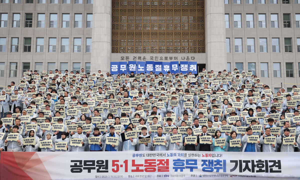 이들은 이날 국회 본관 앞 계단에서 개최한 '공무원 5·1절 노동절 휴무 쟁취 기자회견'에서 "전 세계 노동자의 날인 '노동절'에 대한민국 특수고용 노동자와 플랫폼 프리랜서 노동자, 그리고 우리 공무원 노동자는 근로기준법 사각지대에 남아 여전히 그날을 누리지 못하고 있다"며 이같이 주장했다.