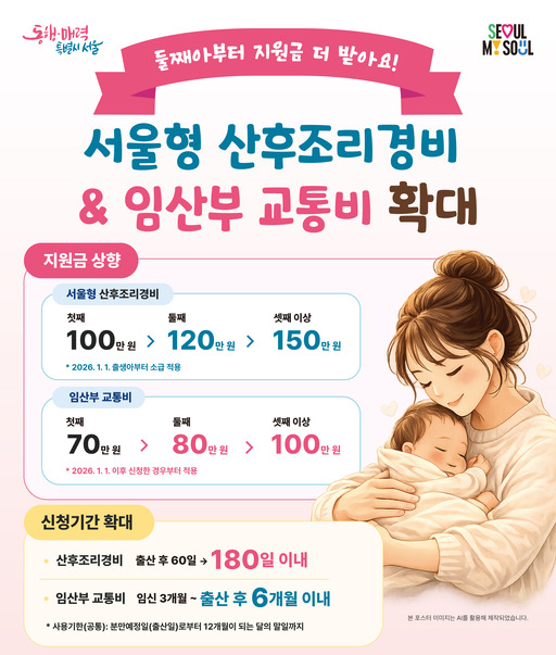 서울시가 산후조리경비와 임산부 교통비를 자녀 수에 따라 차등지급하며 둘째아 이상 출산 가정 지원을 강화한다. 서울 합계출산율이 지난해 0.63명(잠정)으로 소폭 반등했지만 전국 최저 수준인 만큼 다자녀 가구 실질 지원을 늘리겠다는 취지다.