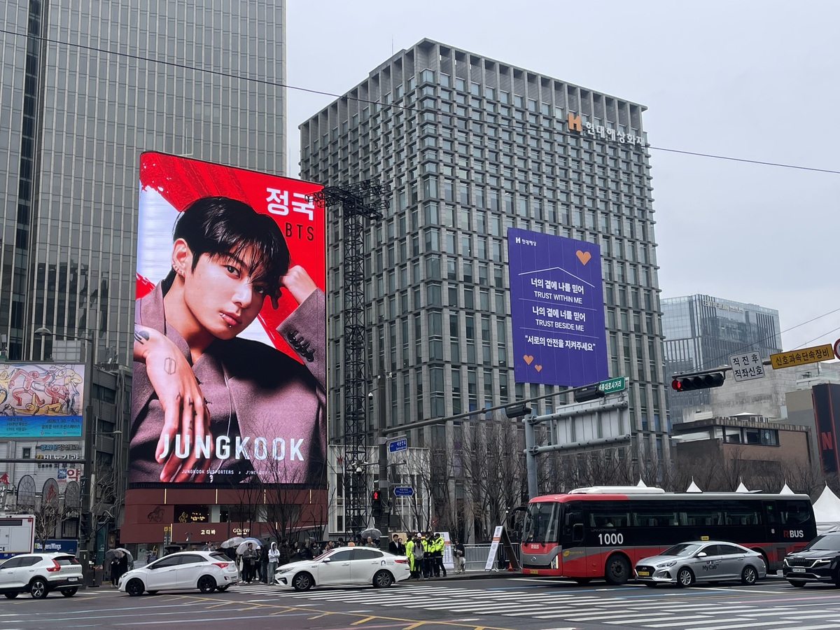 방탄소년단(BTS)의 컴백 공연을 사흘 앞둔 18일 서울 종로구 광화문 광장은 공연 준비로 분주했다. 광화문 앞에는 대형 무대가 설치 중이었으며 광장 일대에 관람 구역을 구분하기 위해 대규모 펜스가 세워졌다. 전광판에 BTS 멤버들의 얼굴이 나오자 시민들은 가던 길을 멈추고 휴대폰 카메라로 연신 셔터를 눌렀다.