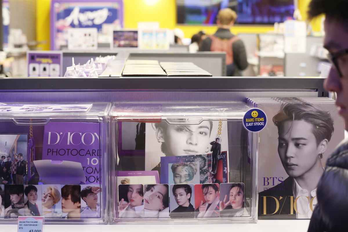 오는 21일 방탄소년단(BTS) 광화문 컴백 공연을 앞둔 15일 서울 명동의 한 K팝 굿즈 판매점에서 외국인 팬이 BTS 관련 상품을 고르고 있다.