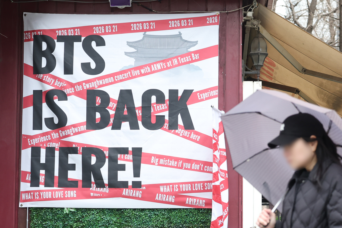 오는 21일 방탄소년단(BTS) 광화문 컴백 공연을 앞둔 15일 서울 중구 무교동의 한 주점에 BTS 팬(아미)을 환영하는 홍보물이 내걸려 있다.