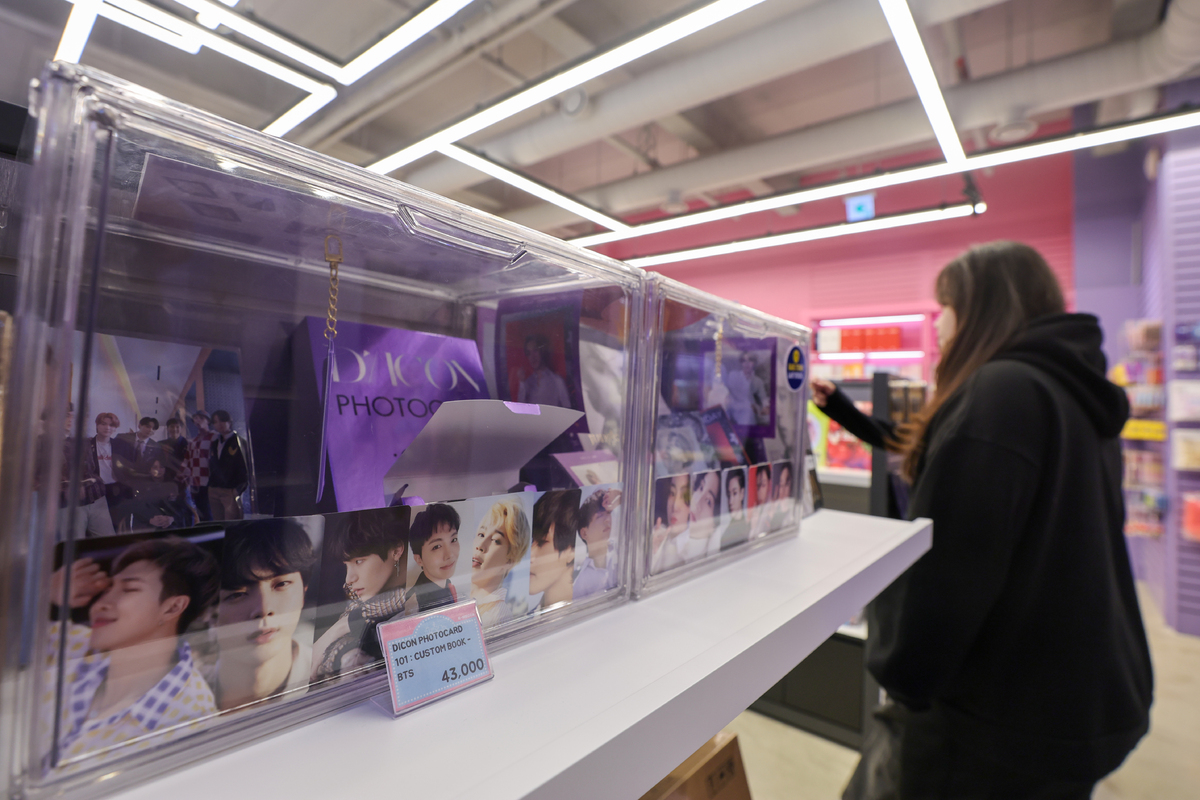 그룹 방탄소년단(BTS)의 광화문 공연을 나흘 앞둔 17일 서울 중구 명동거리 한 케이팝 굿즈샵에 BTS 굿즈들이 진열돼 있다.