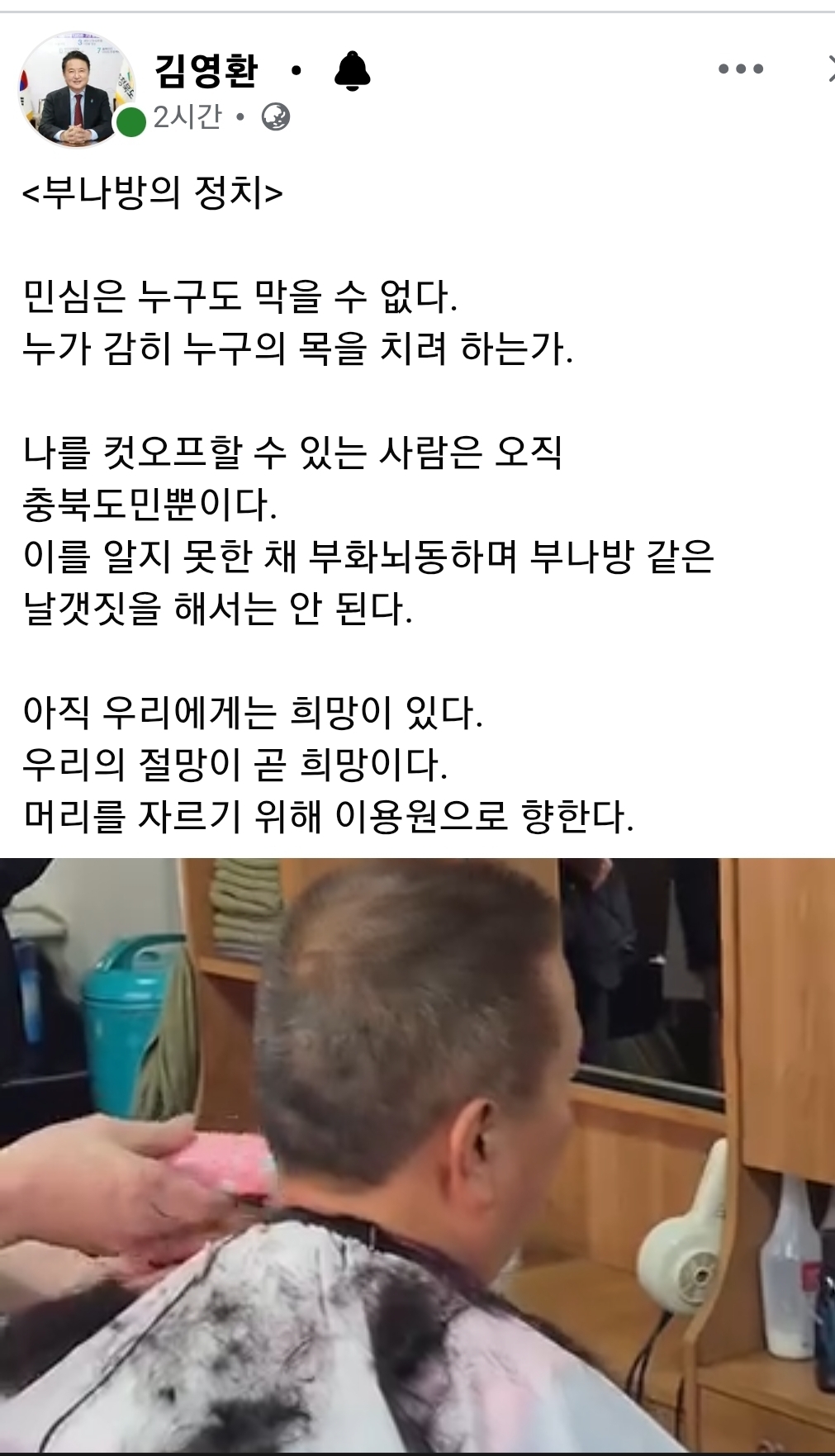 김 지사는 이날 오전 자신의 사회관계망서비스(SNS)에 ‘부나방의 정치’라는 제목에 글과 함께 삭발 과정이 담긴 동영상을 게재했다. 이글에는 “민심은 누구도 막을 수 없다. 누가 감히 누구의 목을 치려 하는가”라며 “나를 컷오프 할 수 있는 사람은 오직 충북도민뿐이다. 이를 알지 못한 채 부화뇌동하며 부나방 같은 날갯짓을 해서는 안 된다”고 적었다. 또 “아직 우리에게는 희망이 있다. 우리의 절망이 곧 희망이다. 머리를 자리기 위해 이용원으로 향한다”고 썼다.