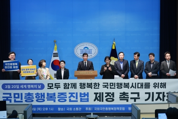국회 국민총행복정책포럼 대표의원인 이해식 국회의원은 “대한민국은 세계적 경제 규모와 높은 교육 수준, 우수한 의료·디지털 인프라를 갖추고 있음에도 국민이 체감하는 행복 수준은 이에 미치지 못하고 있다. OECD 국가 내에서도 하위 그룹이고 아시아 지역에서도 대만, 싱가포르, 태국, 필리핀보다 낮은 순위를 기록했다. 이는 단순히 경제성장의 문제가 아니라 소득 격차, 돌봄과 노동의 부담, 청년의 좌절, 노년의 고립, 지역 간 불균형, 공동체 해체와 사회적 신뢰 저하가 중첩되며 행복의 불평등이 구조화되고 있음을 보여준다”고 분석했다.