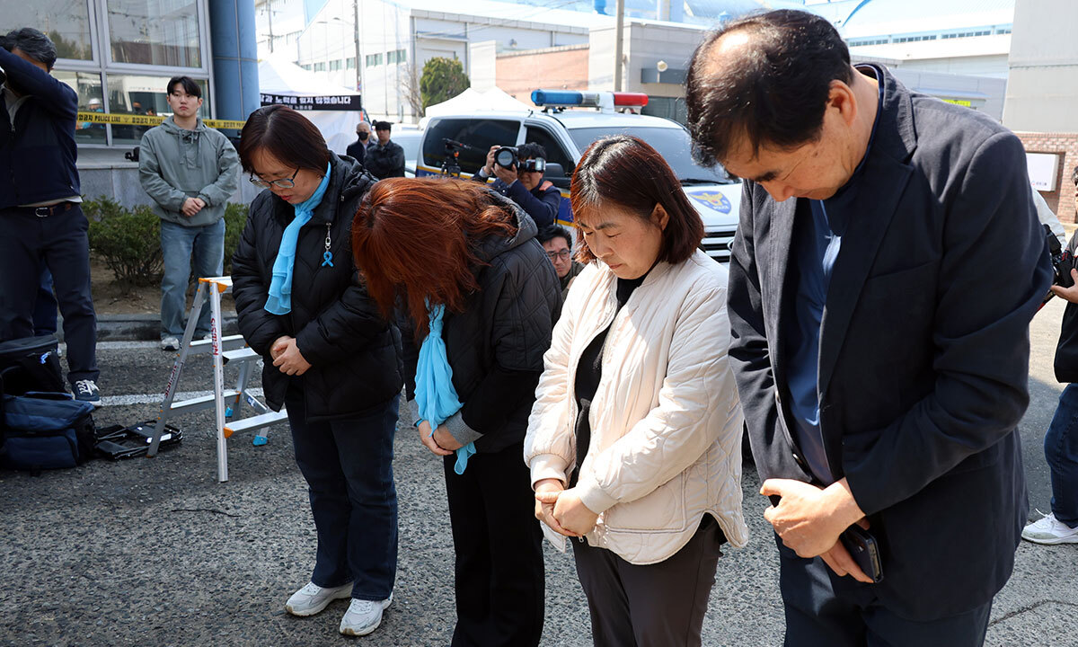 23일 대전 대덕구 안전공업 화재 참사 현장에서 경기 아리셀 공장 화재 참사 대책위·유족 대표들이 희생자들을 향해 묵념하고 있다.