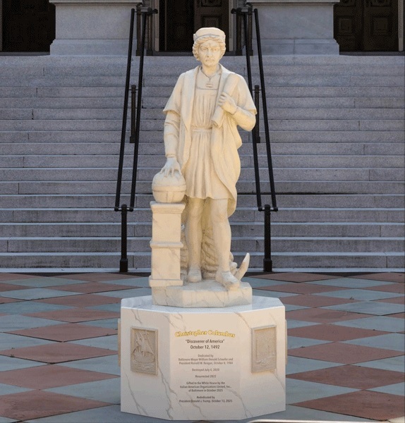 이 동상은 1984년 로널드 레이건 당시 대통령의 참석하에 메릴랜드주 볼티모어에 세워졌던 것이다. 조지 플로이드 사망 사건으로 미국 내 인종차별 반대 시위가 확산하던 2020년 7월 시위대가 동상을 철거해 인근 항구에 버렸고, 이후 이탈리아계 인사들이 수습해 복원했다. 당시 시위대는 콜럼버스가 미국 원주민을 노예로 삼고, 이후 식민지 개척자들이 잔혹한 정복 전쟁을 벌였다고 비판했다.