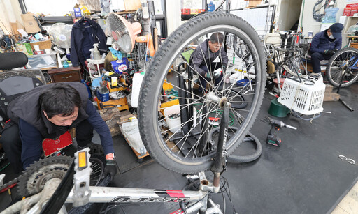 23일 서울 송파구 잠실역 부근 잠실자전거수리센터에서 직원들이 고장 난 자전거를 수리하고 있다. 잠실자전거수리센터는 송파구가 직접 운영하는 곳으로 타이어 펑크, 베어링 교체 등 자전거 수리 서비스를 구민들에게 제공한다.