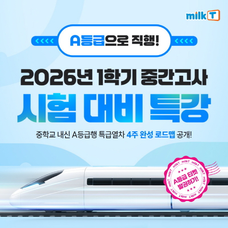 ‘2026년 중학교 1학기 중간고사 시험 대비 특강’ 및 무료체험 이벤트에 대한 자세한 내용은 밀크티중학 공식 홈페이지에서 확인할 수 있다.