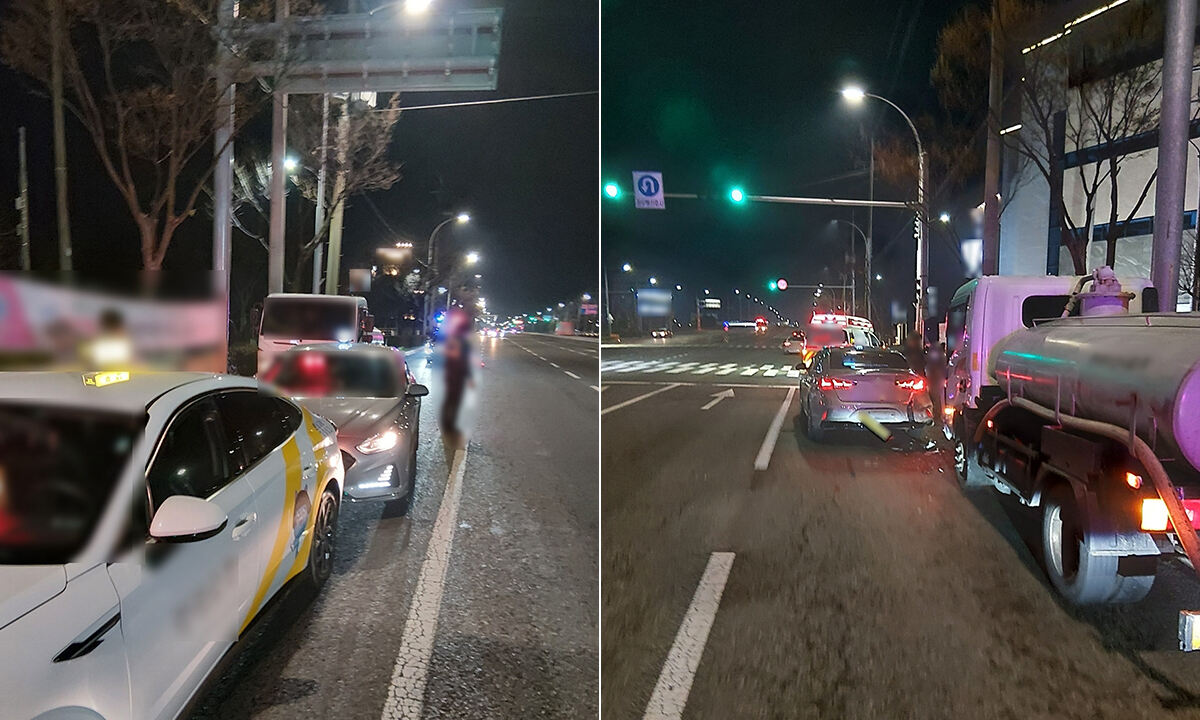 24일 부산 강서경찰서에 따르면 이날 오전 0시5분쯤 부산 강서구 명지동의 한 도로에서 60대 A씨가 운전하던 3.5t 오폐수 운반 트럭이 신호 대기 중이던 택시를 들이받았다. 사고 당시 충격으로 앞으로 밀린 택시가 앞서 정차해 있던 또 다른 택시를 추돌하면서 3중 추돌 사고로 이어졌다.
